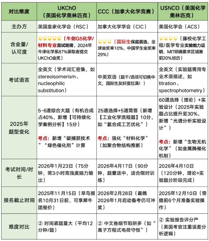 UKChO、CCC、USNCO化学竞赛对比有什么区别?