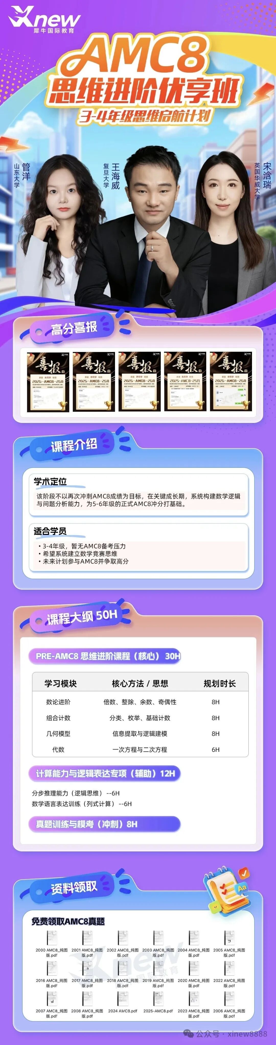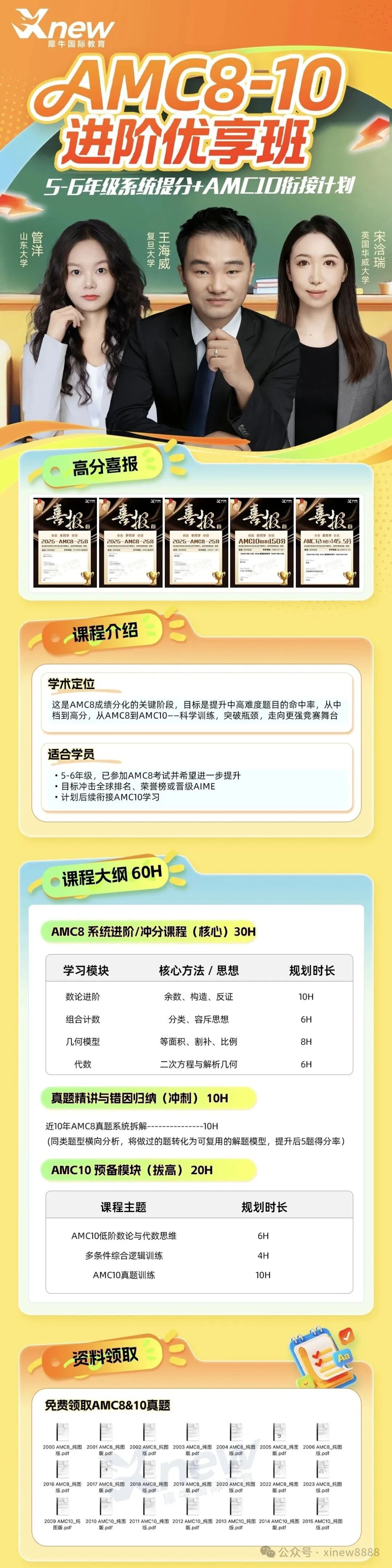 AMC8-10进阶优享班,从中档到高分,进阶冲分,从AMC8到AMC10——科学训练,突破瓶颈,走向更强竞赛舞台。