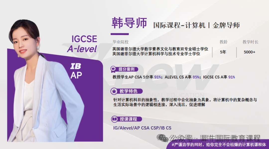 教授学生AP CSA 5分率 91%;ALEVEL CS A率 85%;IGCSE CS A率 91%