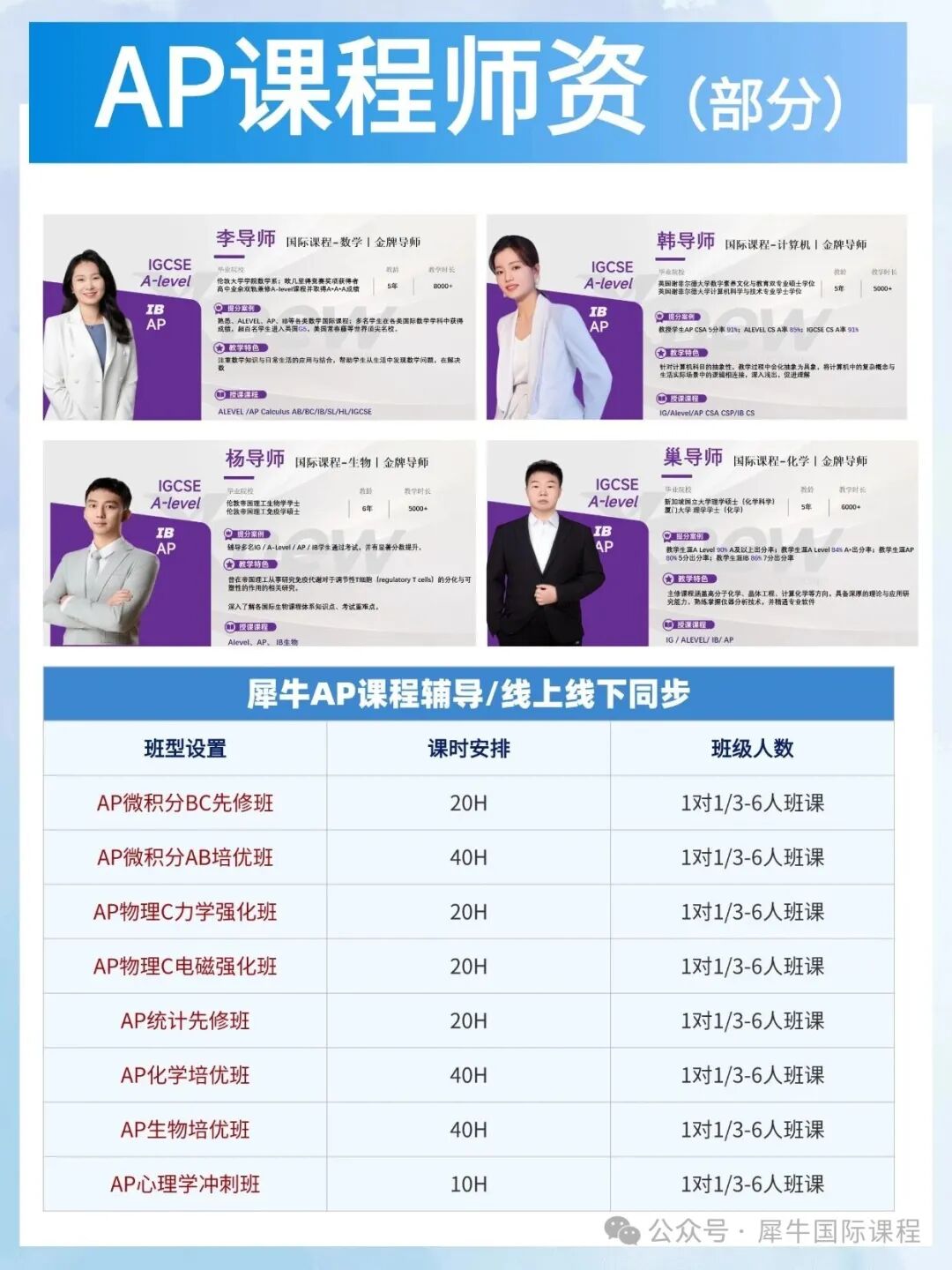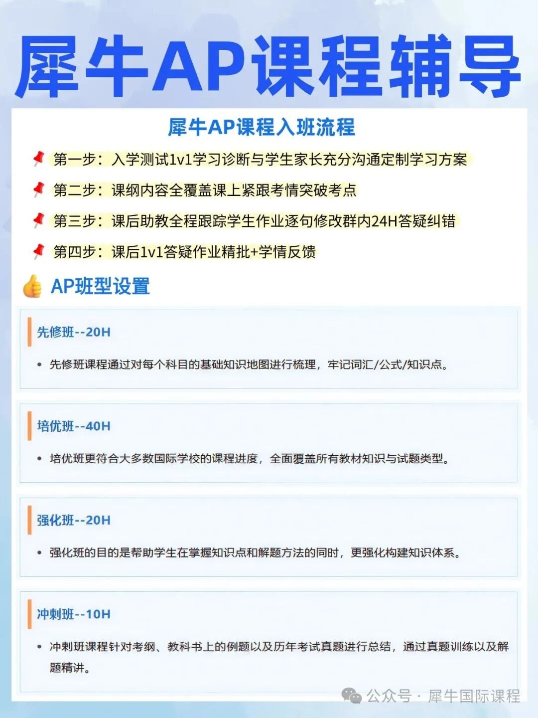 犀牛教育针对AP培训开设科目有AP预备微积分、微积分BC、物理、化学、生物、统计、计算机、宏观经济、微观经济、美国历史等热门科目。