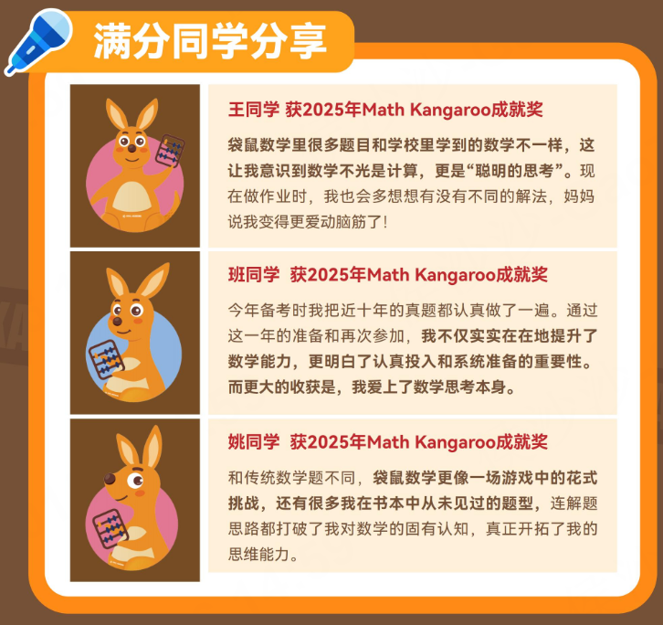 袋鼠竞赛是衔接AMC8等国际顶尖竞赛的绝佳阶梯。通过袋鼠积累经验、适应题型,未来挑战更高难度竞赛时更加从容。正因为其承上启下的作用,袋鼠竞赛含金量高,已成为不少竞赛规划中的“必选项”。