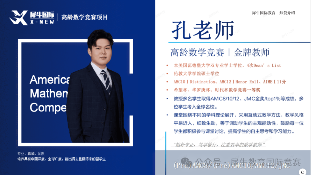 犀牛教育AMC8竞赛师资团队均来自国内外顶尖名校,包括清华、北大、复旦、斯坦福、麻省理工等顶尖院校,人均教学经验超2000小时,且多为数竞获奖者。具备丰富的教学经验和深厚的学术背景,不仅教授知识,更培养数学思维和解决问题的能力。