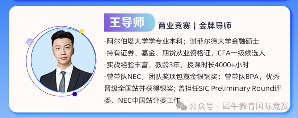 犀牛SIC培训由国外名校精英+投行专业人士团队组成师资队伍,采用基础理论学习+实战交易指导方式,拥有丰富竞赛经验+优异指导成绩,帮助学生培养NEC/SIC/BPA/沃顿商赛等经济财商意识,培养金融投资理念。
