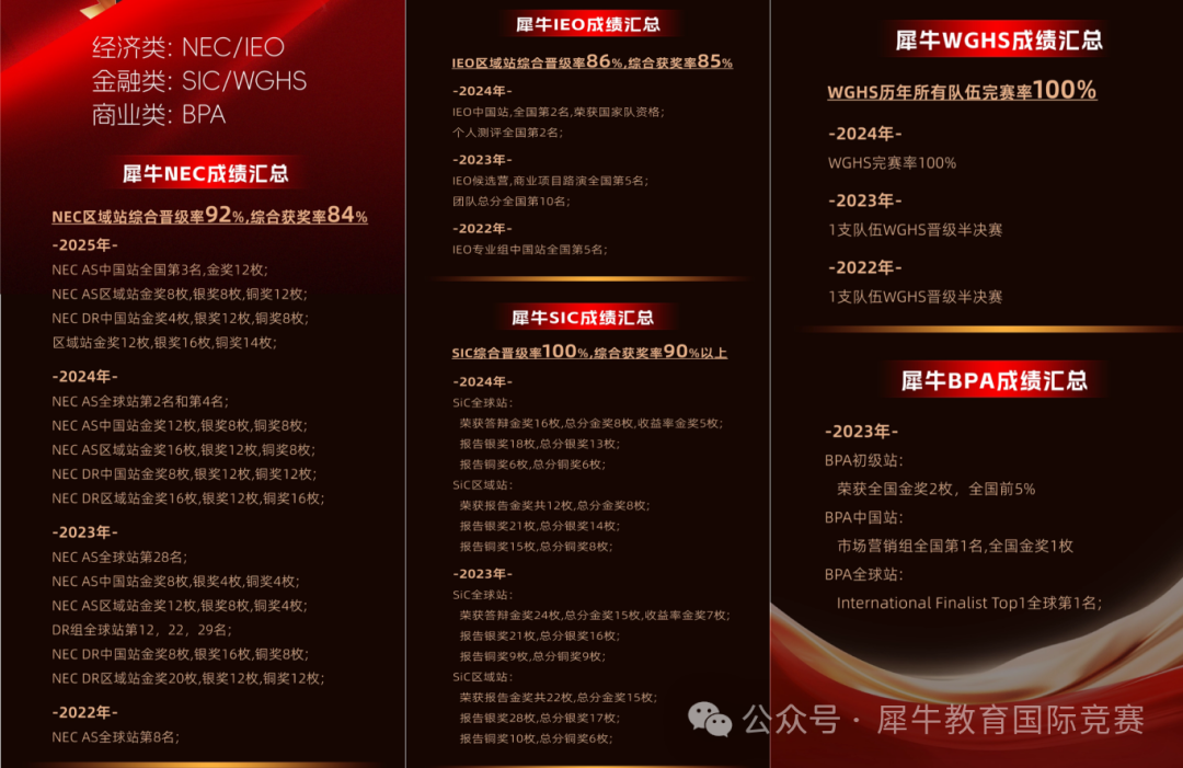 犀牛经济商赛打通NEC竞赛,SIC竞赛,IEO竞赛,BPA竞赛,沃顿商赛等,在以往的竞赛中均取得喜人奖项!2025年犀牛学子获得NEC个人总分世界第一,微观团队全球第二的战绩。