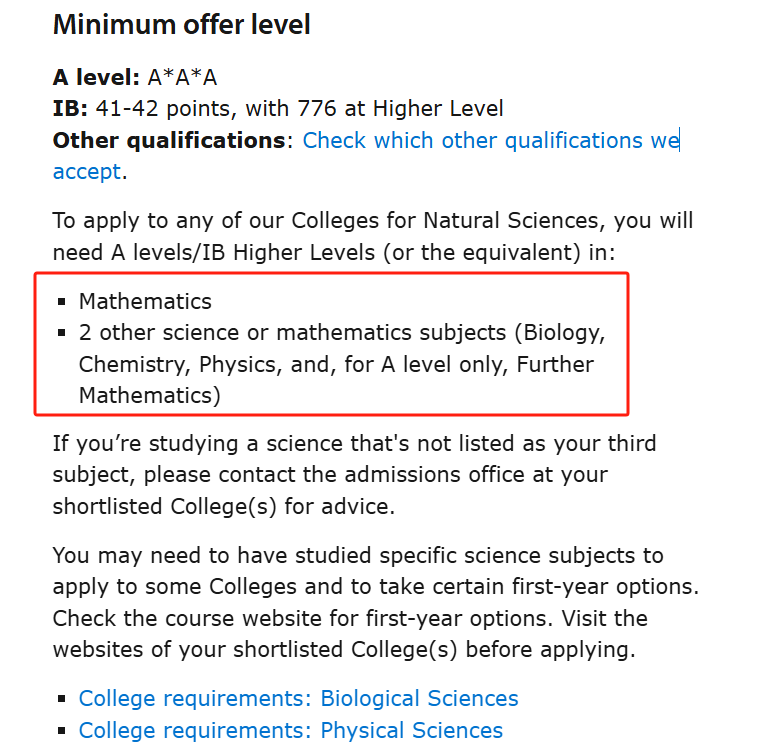 比如说剑桥自然科学专业,对选课的要求是数学+另外两门科学或数学(生物学、化学、物理学;高等数学)。