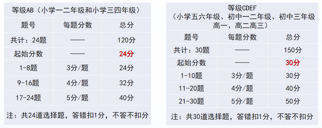 等级C~F: 共30道选择题,总分150分
