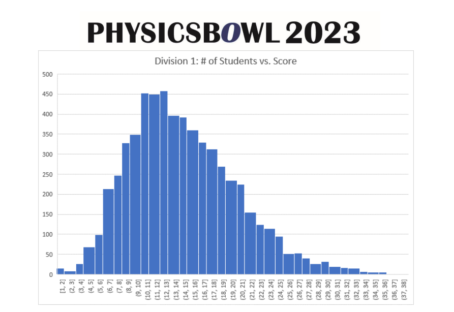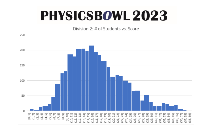 2023年物理碗Division 1 ,满分40分,根据成绩分布图可以看到10~15分区间有更多同学;物理碗Division 2 ,满分40分,更多同学的分数区间处在15~16。