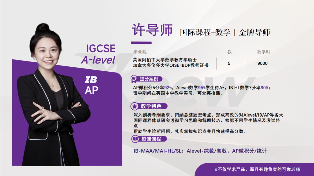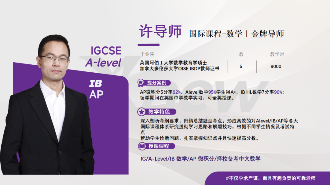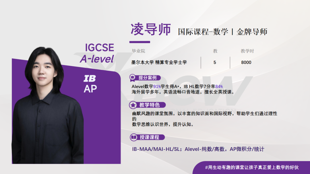 AP微积分5分率92%,Alevel数学95%学生得A*,IB HL数学7分率90%;留学期间在英国中学教学实习,可全英授课。