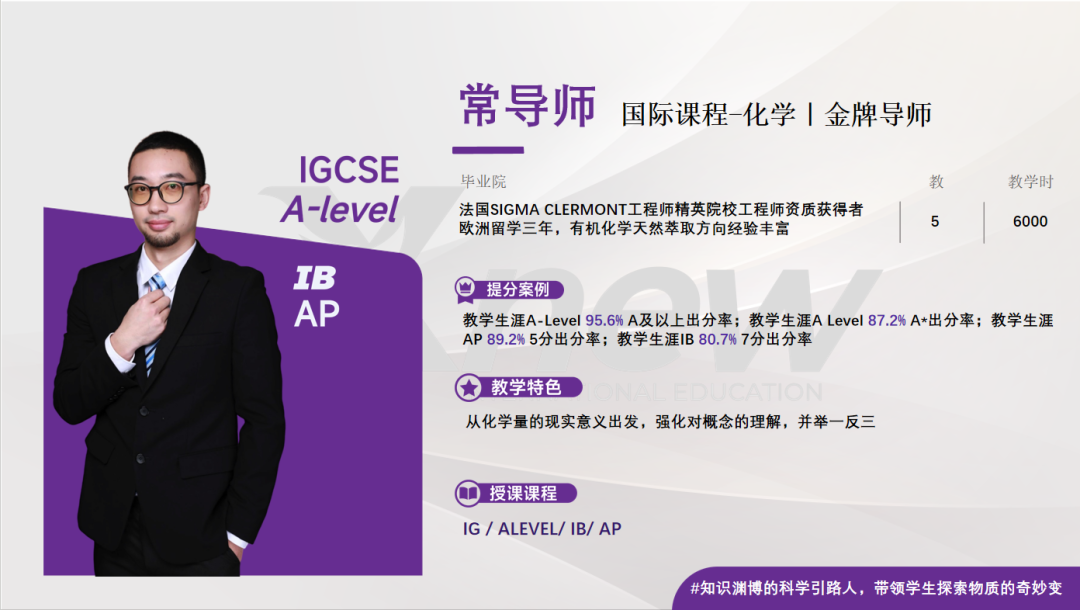 教学生涯A-Level 95.6% A及以上出分率;教学生涯ALevel 87.2% A*出分率;教学生涯AP89.2%5分出分率;教学生涯IB80.7%7分出分率