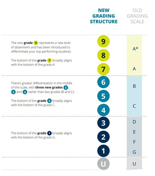 9-1分制:爱德思(Edexcel)和牛津 AQA 考试局采用这一评分标准,9分是最高分(远高于A*水平),1分为最低等级,而U代表不及格。
