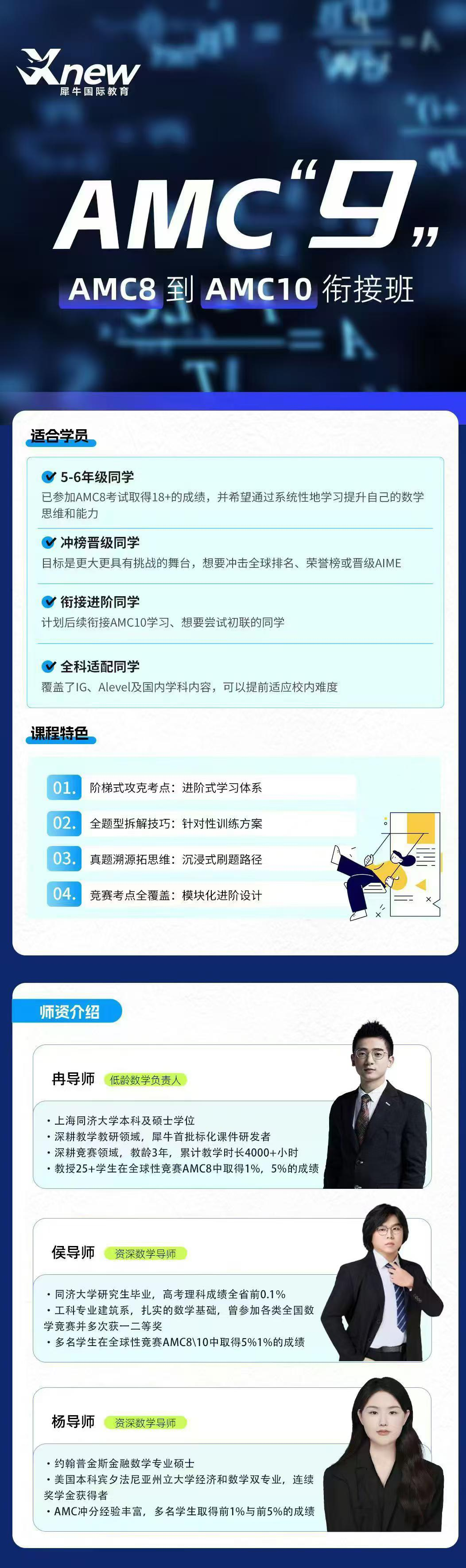 犀牛教育AMC竞赛培训课程,涵盖班型众多,G3-G12不同年级的学生,都可以在犀牛找到自己适配的课程~每位学生会进行测评,先测试,在分班,无论是基础弱想补短板,还是学霸想冲AMC前1%,都能精准匹配!