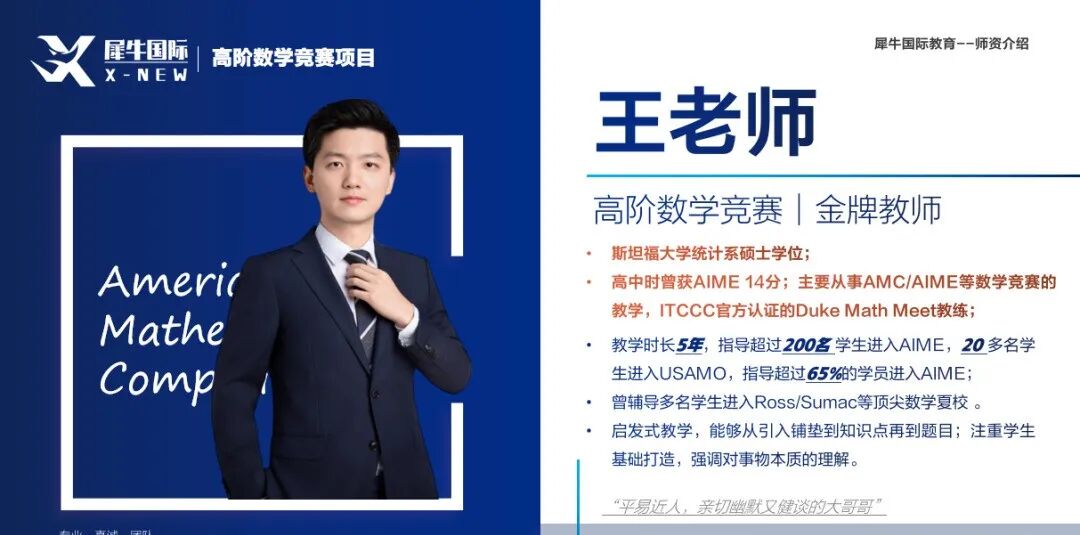 高中时曾获AIME 14分;主要从事AMC/AIME等数学竞赛的教学,ITCCC官方认证的Duke Math Meet教练;