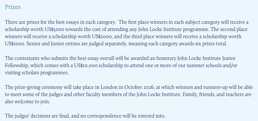 参赛者中提交最佳论文者将获得约翰·洛克研究所荣誉青年研究员称号,并可获得10.000 美元奖学金,用于参加我们的一项或多项暑期学校和/或访问学者项目。