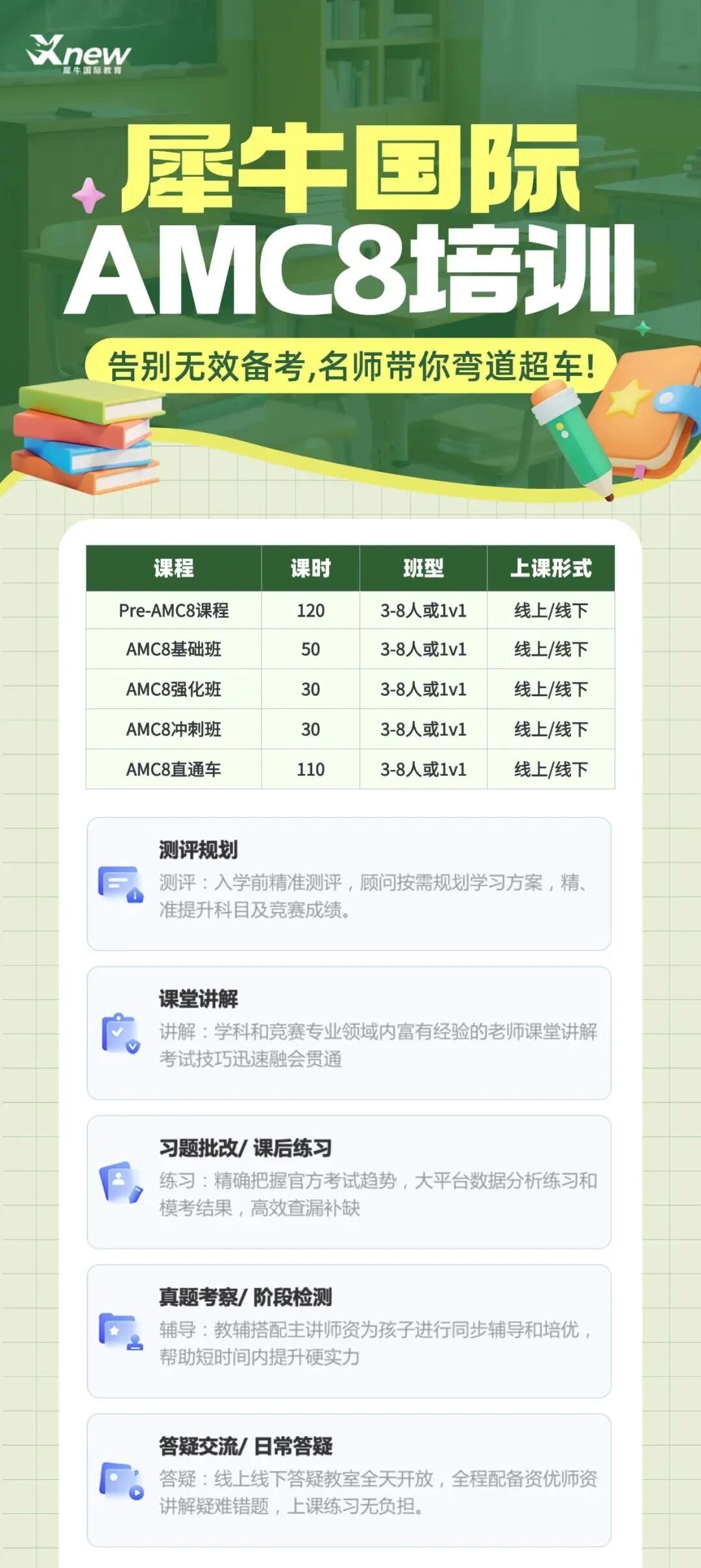 备考方法:以近10年AMC8真题为主,按模块刷题再进行整套试卷模拟,提升答题速度;整理高频考点错题集,定期复盘查漏补缺。