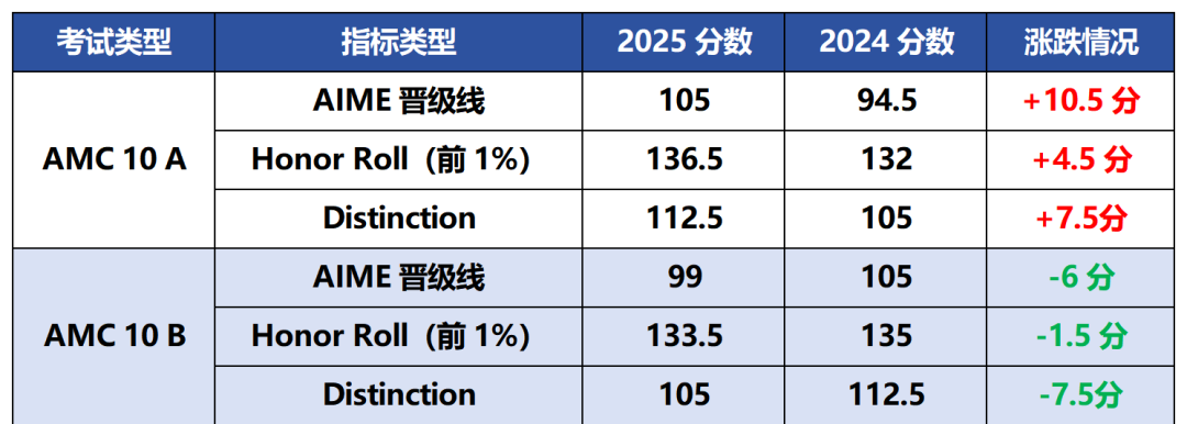 A卷和B卷的奖项分数线(如全球前1%、前5%、AIME晋级线)会因题目难度和考生表现而波动,以2024年为例,AMC10 A卷晋级AIME分数线为94.5分;而B卷的晋级AIME分数线为105分。