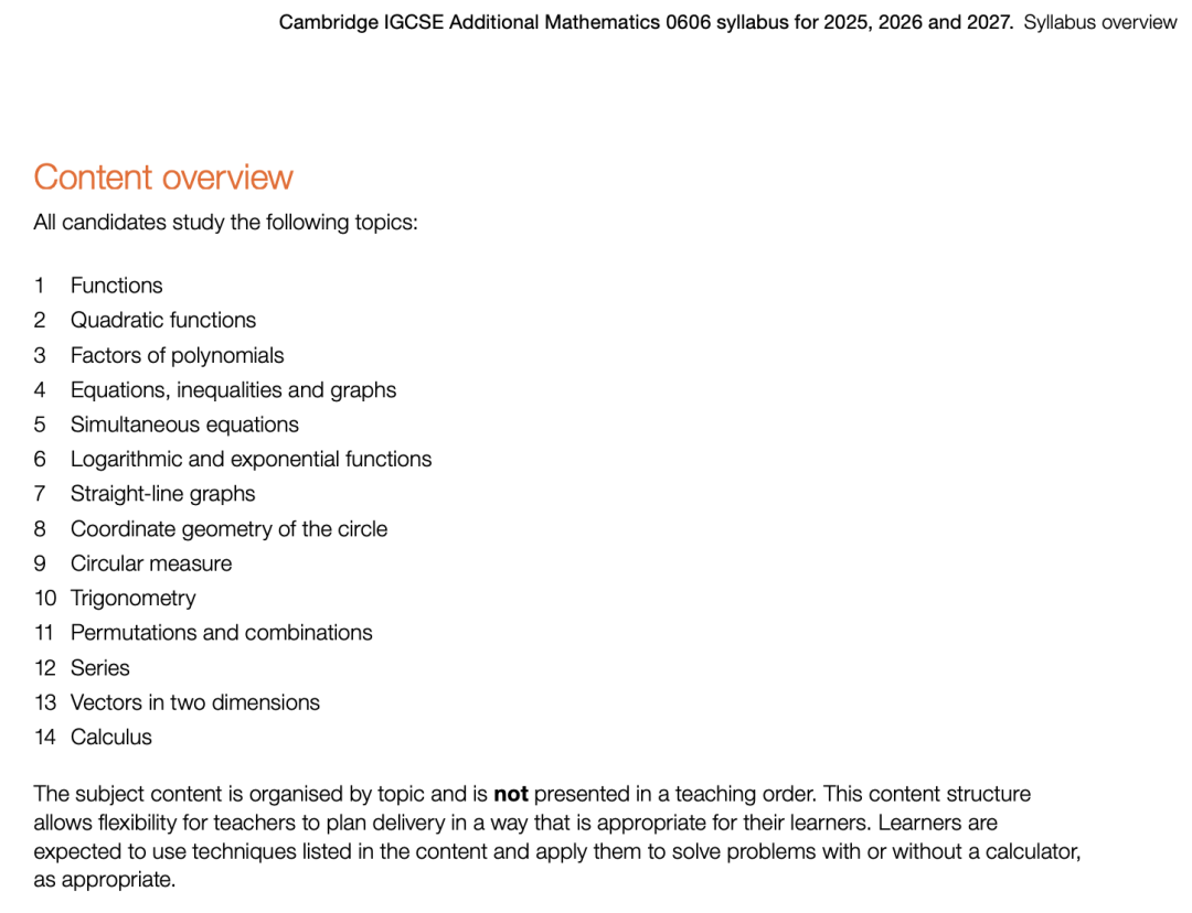 附加数学(0606):函数,二次函数,多项式的因式,方程、不等式与图像,联立方程对数函数与指数函数,直线图像,圆的坐标几何,弧度制,三角学,排列与组合,数列,二维向量,微积分