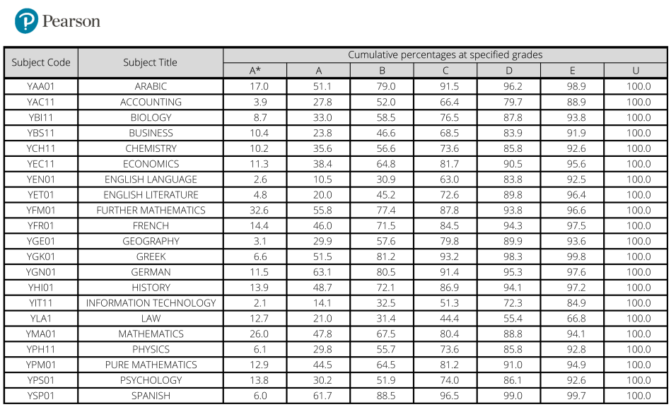 以选择人数较多的Edexcel考试局为例,2025年夏季大考A-Level各科目数据如下: