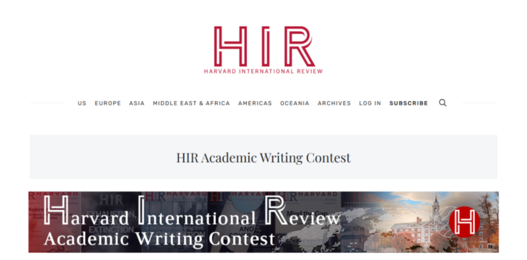 HIR哈佛国际评论学术写作竞赛(Harvard International Review Academic Writing Contest)由哈佛大学旗下具有四十多年历史的权威期刊《哈佛国际评论》(Harvard International Review)主办,是国际关系与全球事务领域最具影响力的中学生竞赛之一。