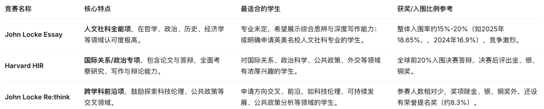 建议主攻John Locke Essay竞赛,冲击高认可度。可同时用Harvard HIR作为保底或补充,因其获奖机会相对多元,且能展现类似的国际视野与分析能力。
