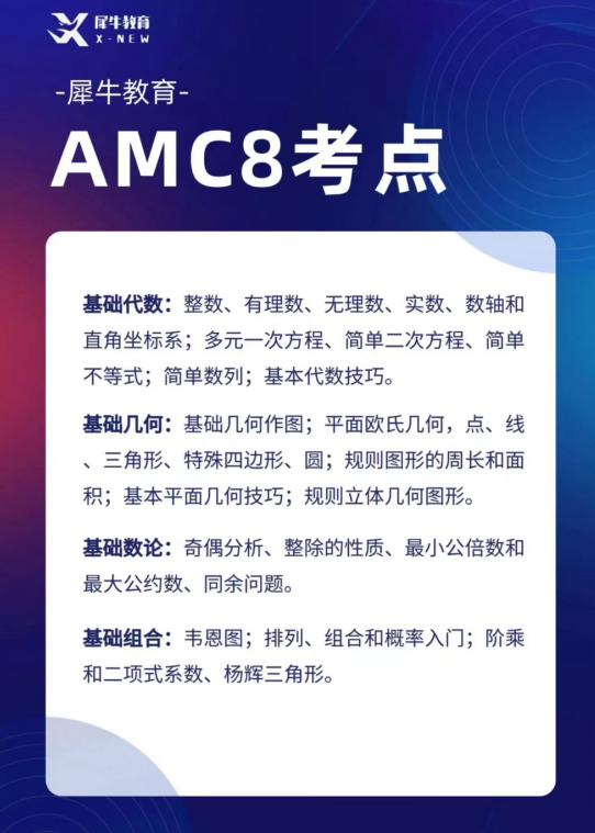 AMC8数学竞赛的考试内容主要分成三块:小学课内知识、小学奥数知识,还有初中课内知识。