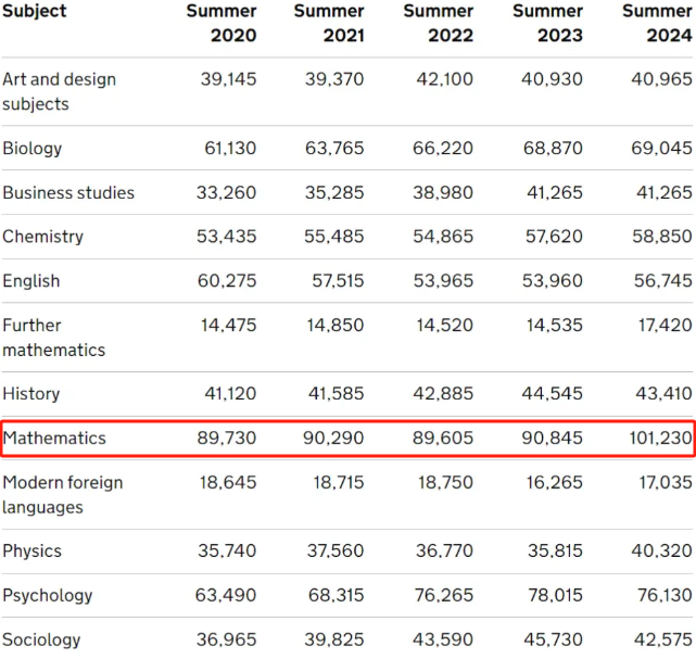 官方数据显示,2024年夏季A-Level数学考试的报名人数已经超过10万;并且在多数科目报名人数较去年都呈下降趋势的情况下,只有A-Level数学的报名人数上涨11.4%。