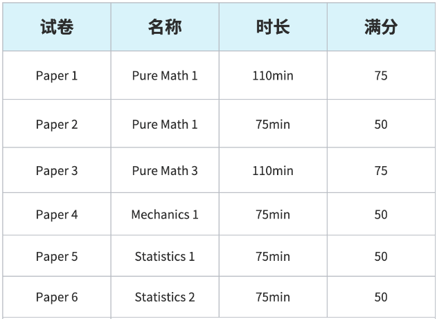 A-Level 数学考试共设置 6 个 paper,分别是纯数 P1、P2、P3,力学 M1,统计学 S1、S2。