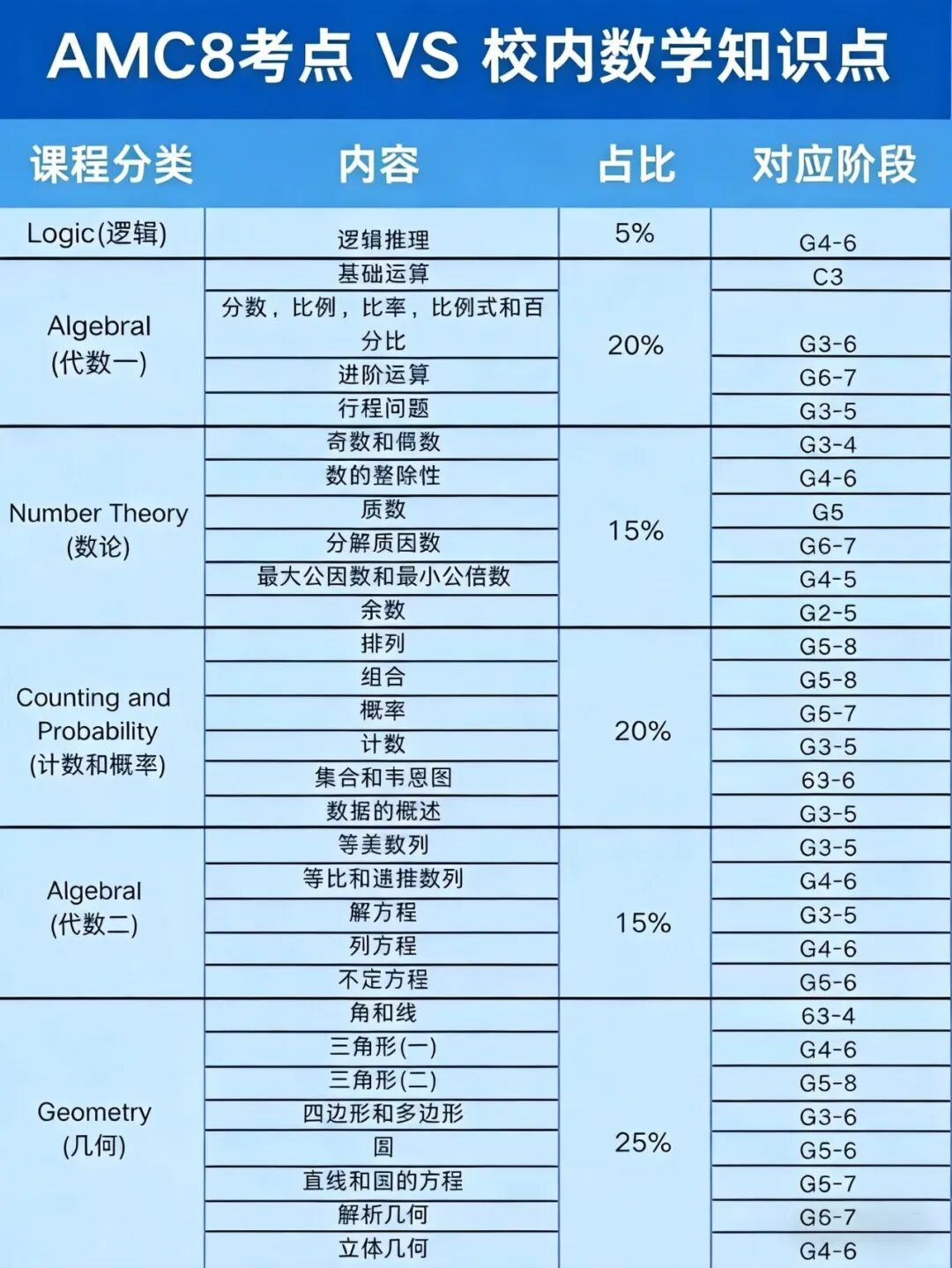 简单来说:AMC8的知识跨度,覆盖了从小学六年级到初中二年级的核心内容。