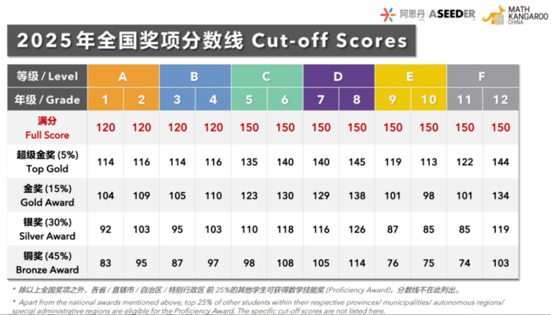 数学技能奖:各赛区除全国奖项之外前25%