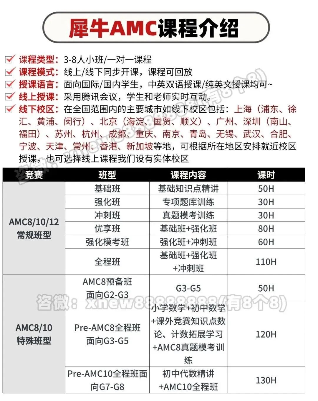 犀牛培训机构针对AMC8打造了阶梯式课程体系,从Pre-AMC8启蒙到基础、强化、冲刺,精准匹配不同年级、不同基础的娃,3-8人小班授课,还有1v1定制课,线上线下同步开课,全国多校区可就近选择。