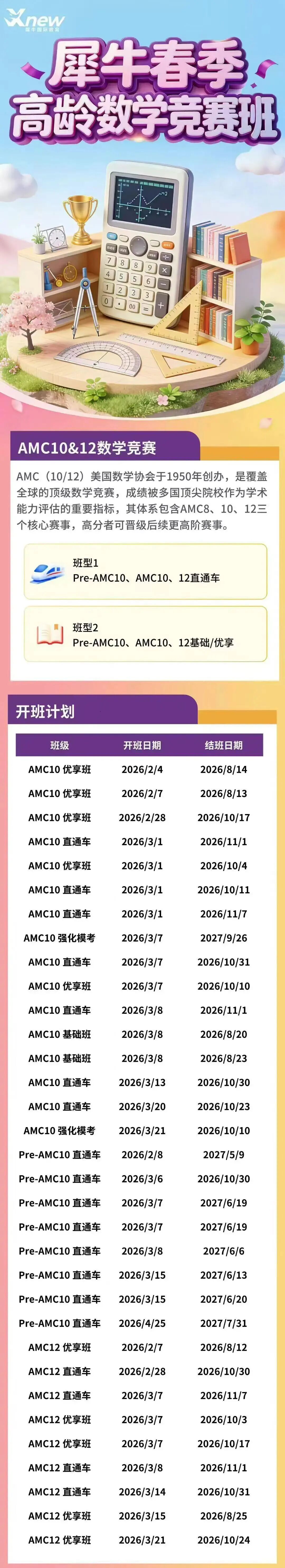 2026年AMC10数学竞赛备考黄金期已经到了,别等到考前一两个月才慌慌张张冲刺,犀牛AMC10数学竞赛春季长线培训课程现在开班,从基础到拔高,一步到位,稳稳拿下好成绩!