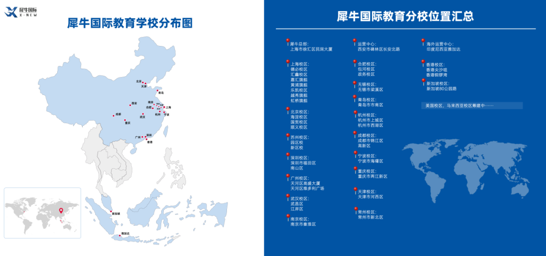 犀牛国际教育在上海,北京,南京,合肥,深圳,青岛,武汉,苏州,广州,杭州,无锡,宁波,重庆,成都、香港、天津、新加坡……等城市均有校区,线下开设小班课或者一对一,其他城市学员/距离当地校区太远,可参加线上直播课程,免费看回放