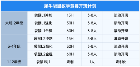 犀牛深耕国际数学竞赛,针对袋鼠竞赛,除了袋鼠考前冲刺班,还有袋鼠直通车,强化班等多种课程,针对不同基础的学生设置。