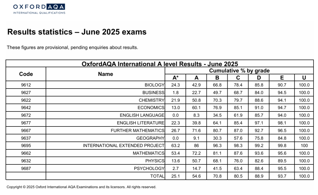 牛津AQA数学学科的A*率逆天,超一半学生拿A*。生物和化学的A*率也比其他两个考试局高。经济的A*率最低,但是A及以上比率却不低,说明拿A的同学非常多。物理A*率比较低,不管哪个考试局,依旧是比较难的学科。