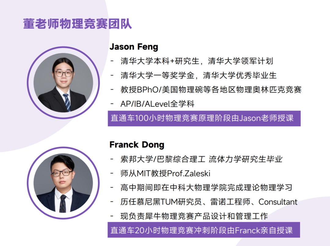 由犀牛物理竞赛教学负责人董老师领衔授课,以及清华本硕冯老师,北大毕业吴老师,南洋理工大学硕士蒋老师带队授课!