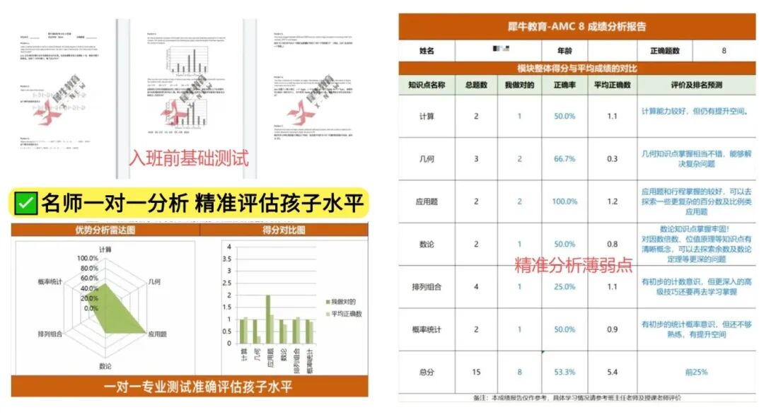 和校内的数学仍然是有不同的,整体的难度会略高,因此先评测基础,或者摸底孩子是否接触过代数、几何、数论、组合板块的内容。