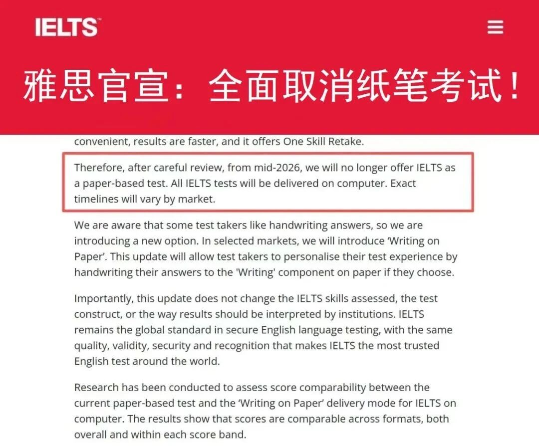 雅思官方(BC/IDP)近期发布全球公告:自2026年年中开始,传统纸笔考试将在全球范围内陆续取消,全面 transition 至机考模式。