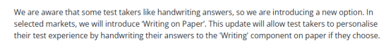 官方考虑到部分考生长期手写答题的习惯,将在指定考区推出“Writing on Paper”可选模式,听力、阅读、口语三科采用机考,仅写作部分可选择纸笔手写完成。