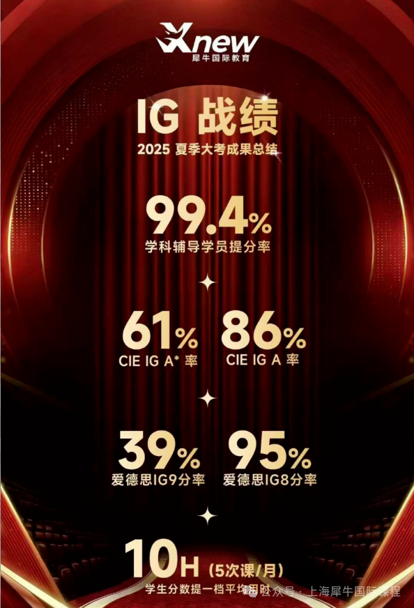 2025年夏季大考中,犀牛学员IGCSE提分率高达99.4%,其中CIE考试局A*率达61%,A率达86%;Edexcel考试局9分率达39%,8分率达95%,远超全球行业水平。