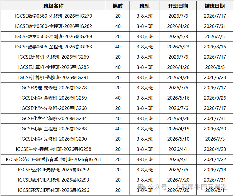 北京犀牛IGCSE五月大考课程新班已开!线下校区的海淀,国贸,顺义,3-8人小班+1对1、线上线下同步、3V1督学,2026年IGCSE迎来多项考纲与考试形式调整,核心变化集中在英语文学开卷、数学考试结构重平衡、科学科目实践强化三大方向,同学们需要注意!