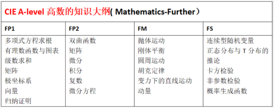 A-level高数同样考4张paper,AS阶段必须选择FP1.另外一个paper可以在Mechanics(P3)和Statistics(P4)中选择。其中,AS阶段必修FP1、A2必修FP2.以及FM和FS。