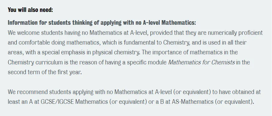 KCL化学相关专业也有类似成绩政策,建议没有Alevel数学(或同等学历)成绩的学生在GCSE/IGCSE数学(或同等学历)中至少获得A或AS数学获得B。