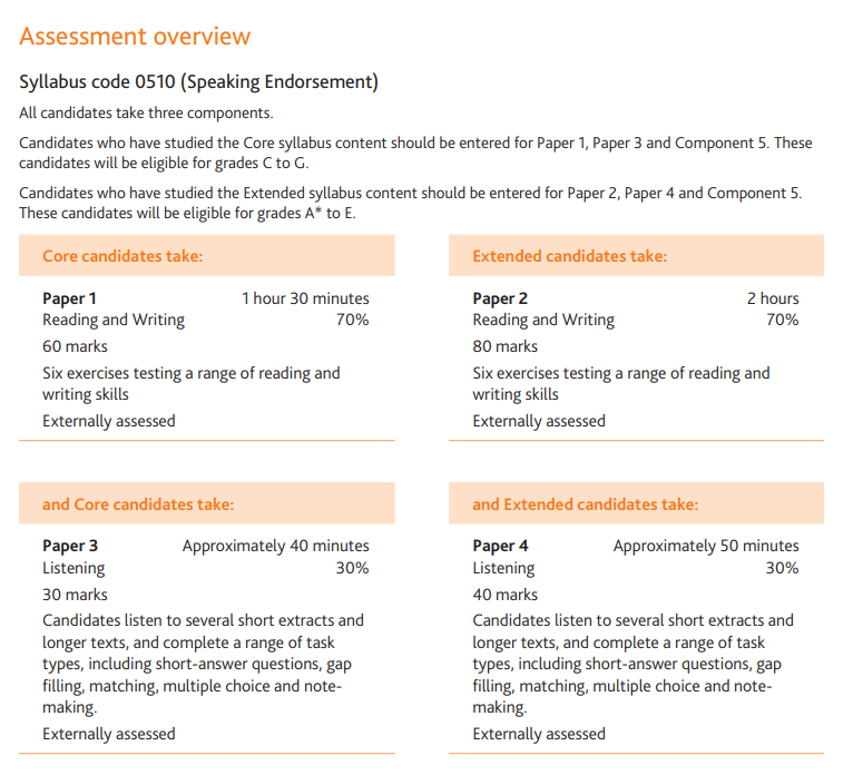EFL课程内容上reading和writing各占较大比例(如CAIE考试局中占比各为50%),同时也会涉及到听力、口语、文学、语法以及英语文化等内容,难度相对较大,要求学生具备较高的英语水平和熟练的语言运用能力;