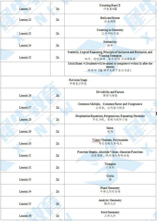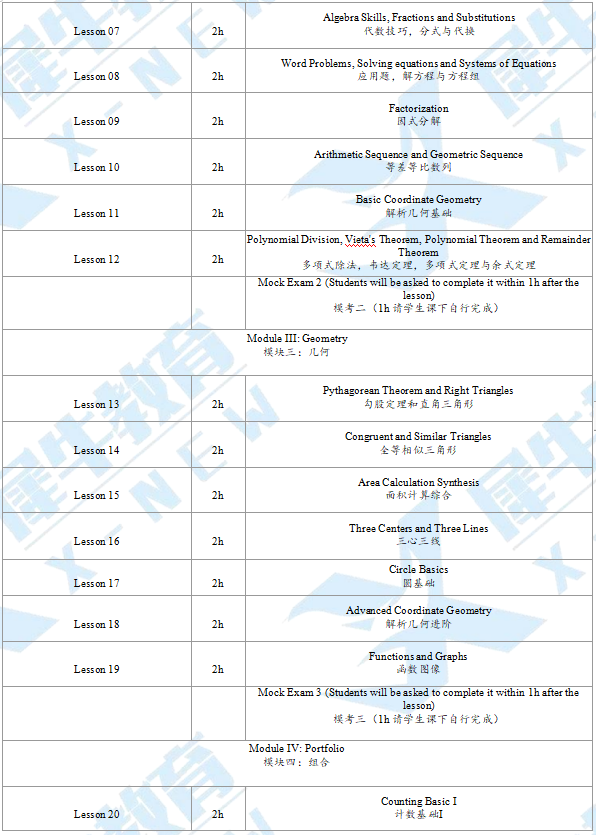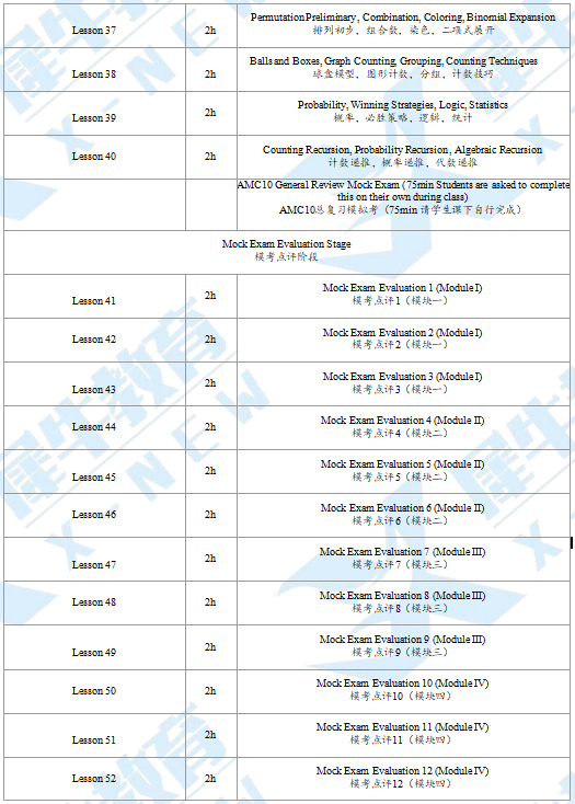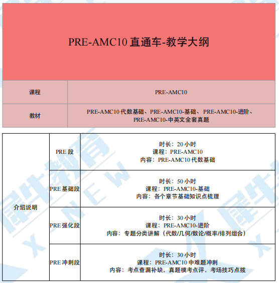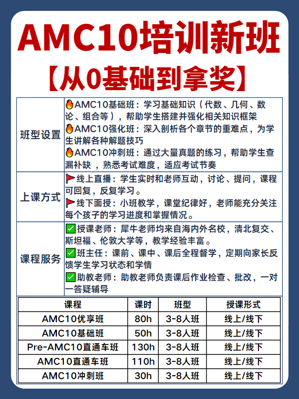 课程内容:衔接20h+基础50h+强化30h+冲刺30h,搭建竞赛框架,从校内数学过渡到 AMC10