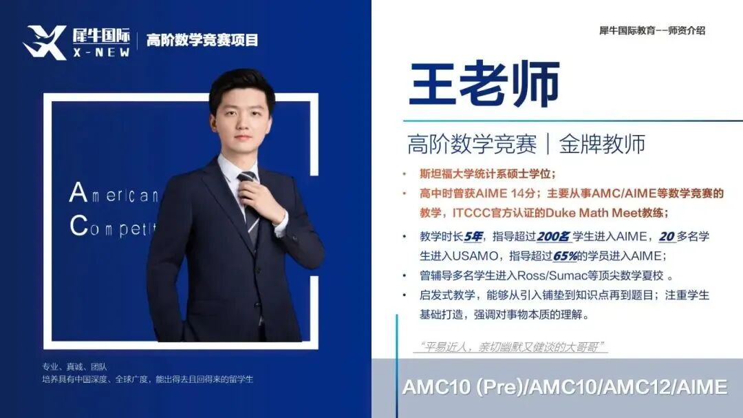 竞赛实战出身:多位老师自身拿过 AMC10/12 Distinction、AIME高分(11–14分),或国内数学联赛一等奖,深谙命题与解题逻辑。
