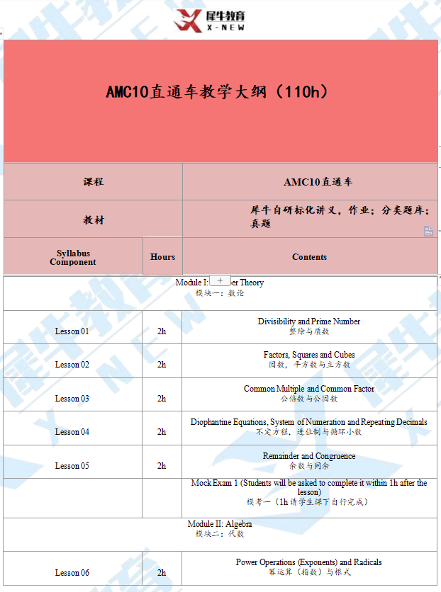 自研专属教材:犀牛教研团队编写,精准对标AMC10考纲,覆盖四大模块,含纸质讲义+配套作业。