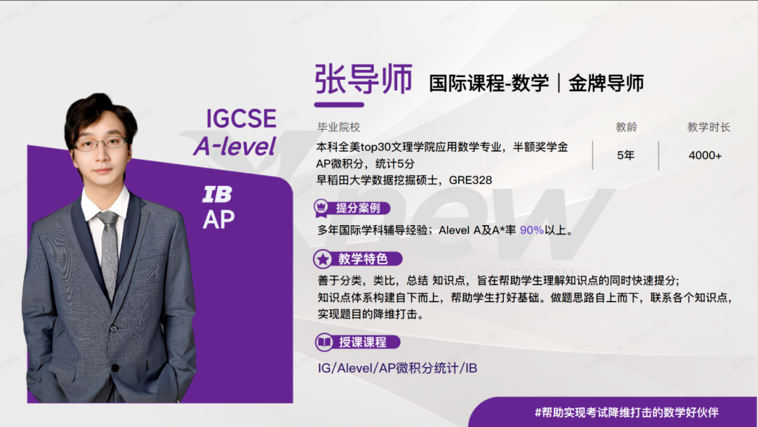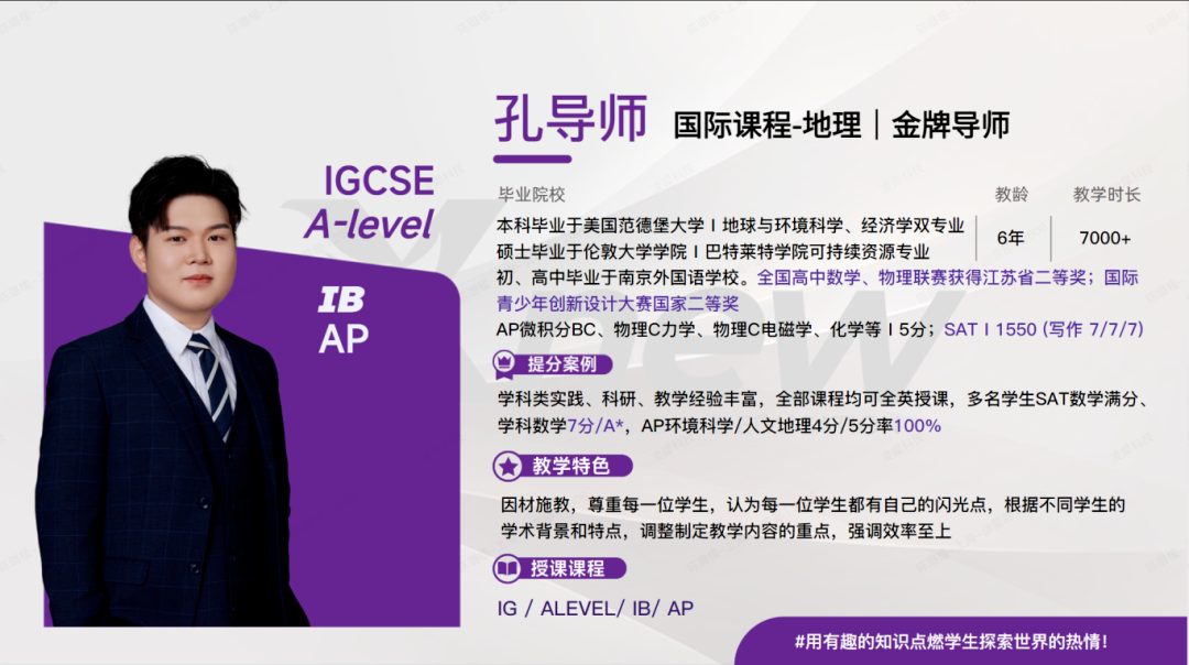 IB课程难度大,对知识点专业性要求非常高,犀牛教育老师都是国际学科和竞赛专业领域内,最有经验的老师,90%以上老师来自全球TOP前50的世界知名院校, 教学团队整体教学经验平均2000小时以上!可以辅导IB数理化生全科,以及EE论文辅导,帮助学生更深入IB知识点学习,掌握IB考试解题思路。