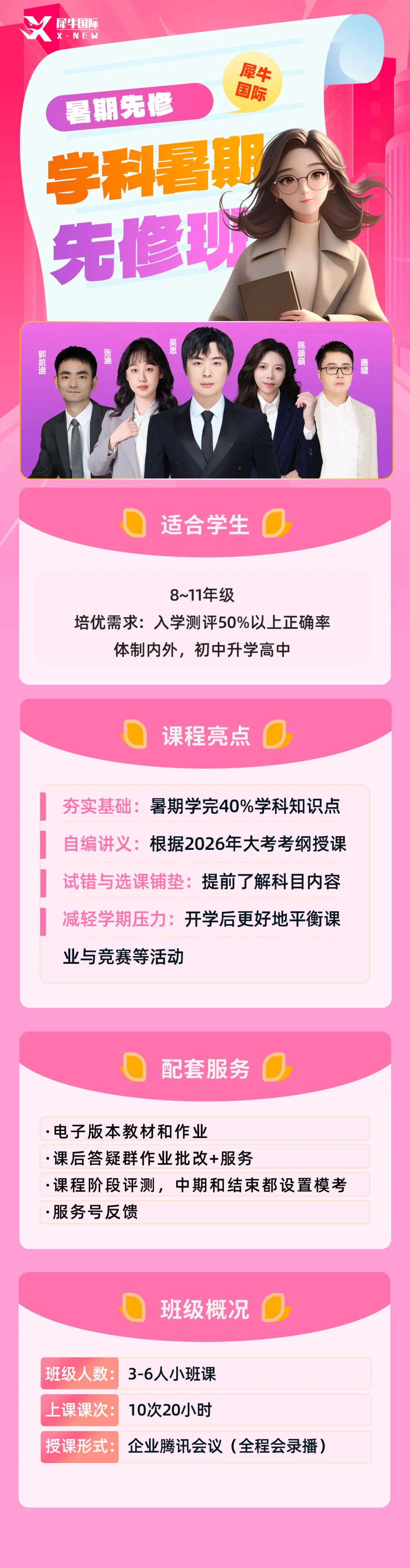 犀牛教育师资团队优选海内外名校毕业的优质老师,包括:清北大学、剑桥大学、帝国理工、新加坡国立等藤校G5院校,教学经验丰富,精准把握考试重难点,全面助力学生备考,为学生提供高质量教学服务。