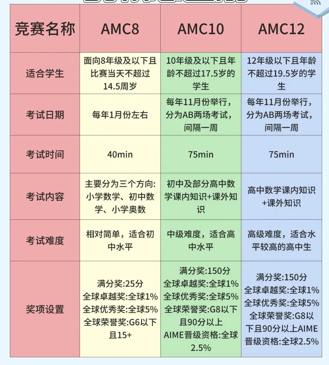 考试内容: 涵盖9-10年级的数学知识,不包括微积分。题目难度比AMC 8有显著提升,涉及更深的代数、几何、数论和组合数学。