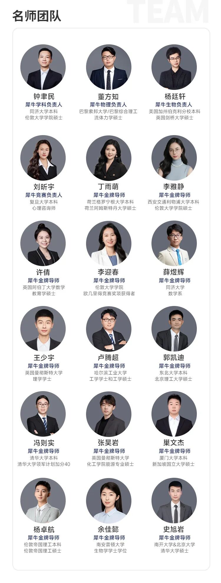 犀牛AP大考冲刺班主讲老师来自剑桥大学、帝国理工、斯坦佛等世界TOP名校,为学员配备助教与班主任,让家长放心,孩子安心。