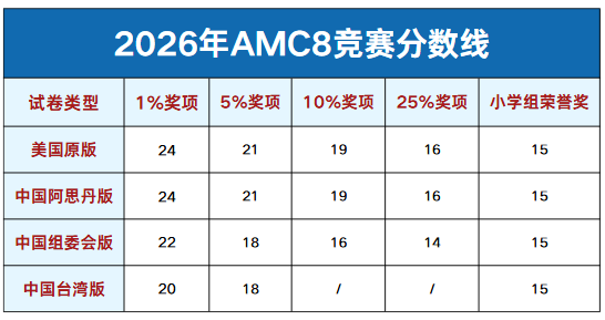 回顾今年AMC8 分数线情况如下:中国组委会单独划定分数线,阿思丹版分数线与北美赛区相同。两种分数线均经 MAA 认证,证书效力一致,仅标注奖项级别,不显示国别及分数线差异。